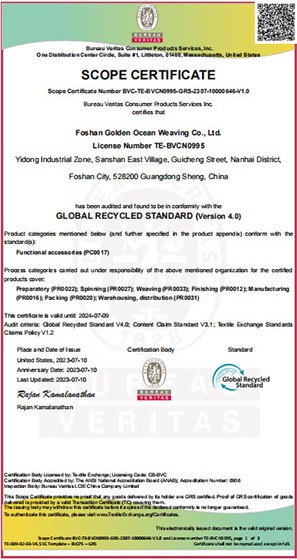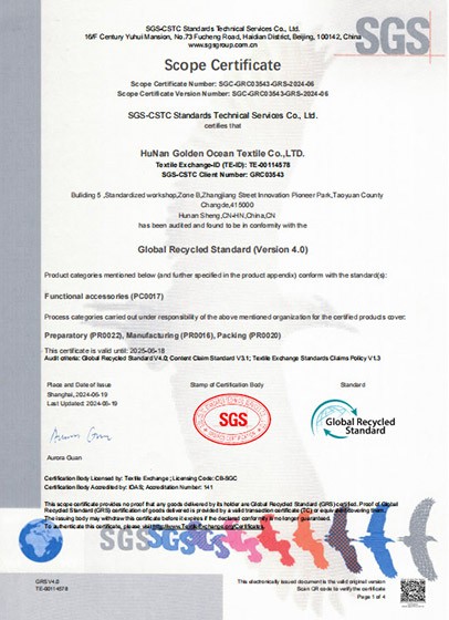 The GRS (Global Recycle Standard) is an international, voluntary certification standard for products made from recycled materials. It focuses not only on the recycled content of products but also covers multiple aspects such as social responsibility, environmental protection, chemical use, and product traceability. The core objective of GRS certification is to ensure that relevant products or parts of products contain materials recovered through recycling, which helps reduce dependence on limited natural resources and minimize environmental impacts during the production process.